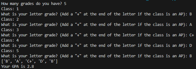 The GPA Calculator is a python program that aims to help high school students easily calculate their GPA. At my high school, there was no such thing as a “B-“ or an “A+”, so it only takes the base letter grade. However, if the class is an AP class, the calculator will take the grade as a 5.0 grade scale. First, the program asks the user to input the number of grades they have, and then ask for their grade in each class, with a + at the end of a Letter indicating it is an AP class. After, the user’s GPA is calculated and printed.